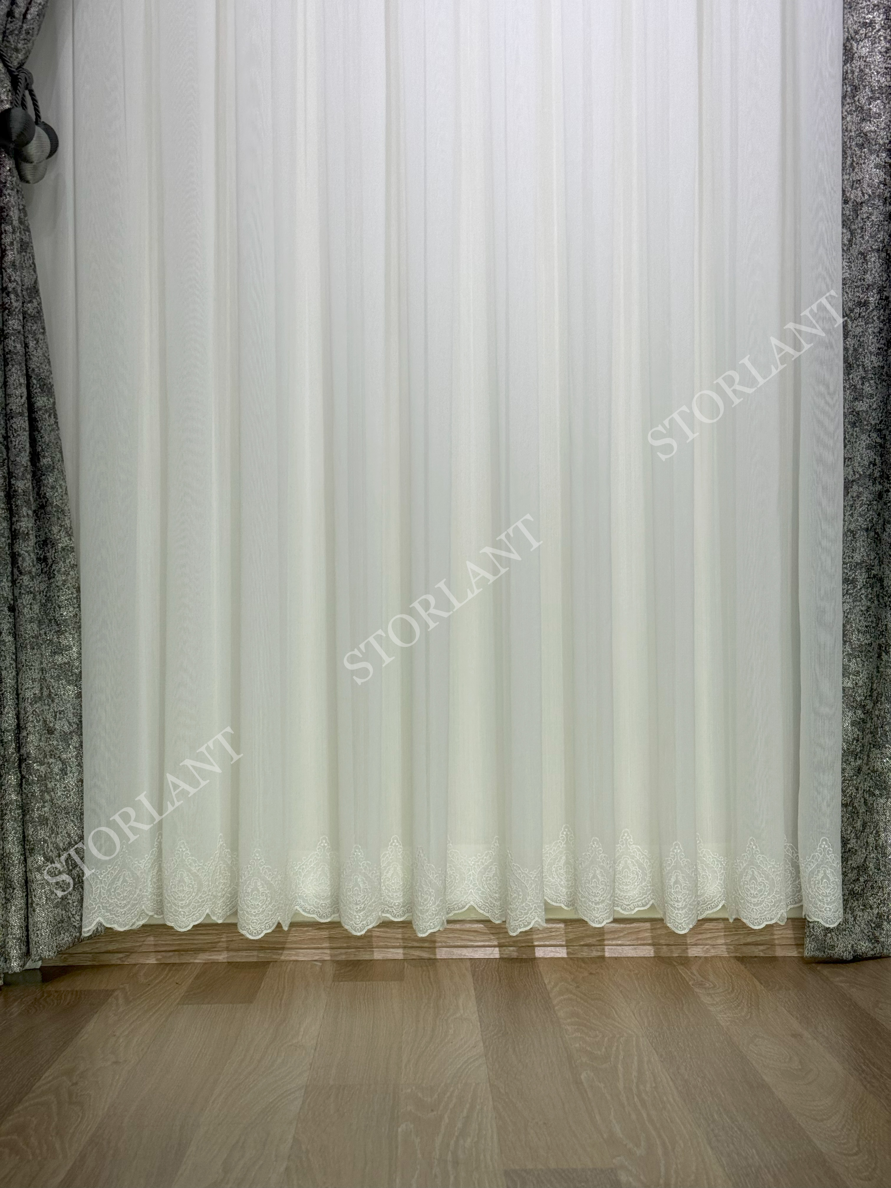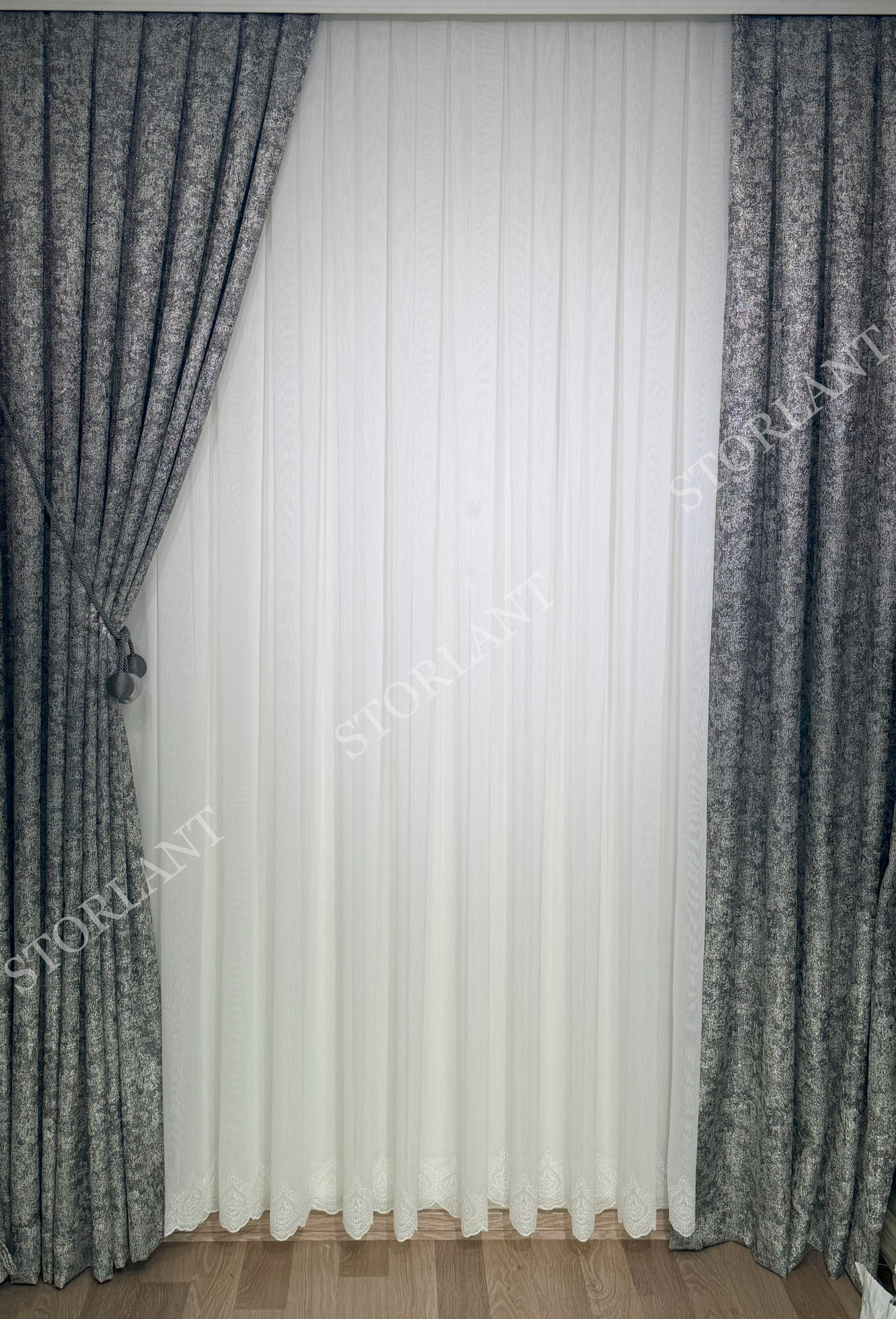 Yoğun dokusu ve zarif dantel detayı sayesinde lüks bir atmosfer oluşturur. 1/3 sık boru pile yapısı formunu uzun yıllar korur ve ütü gerektirmeden her daim düzgün duruşunu muhafaza eder. Diora modeli, salon, oturma odası ve misafir alanlarında sade şıklığın öne çıktığı yaşam alanları için idealdir.